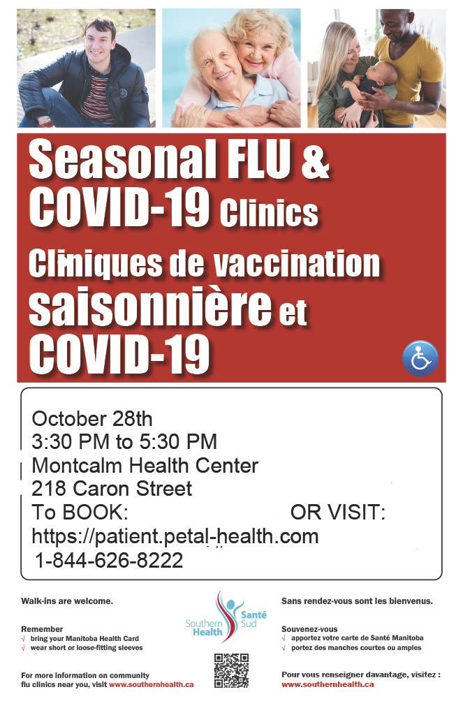Flu Clinic - Cliniques de vaccination When: Tuesday, October 28, 2025 at 3:30 PM to Tuesday, October 28, 2025 at 5:30 PM October 28th 3:30 PM - 5:30 PM Montcalm Health Center 218 Caron Street le 28 octobre 15h30 - 17h30 Centre de Santé Montcalm 218 Caron Street Flu Clinic - St Jean 2025 Cliniques de vaccination - Saint Jean 2025